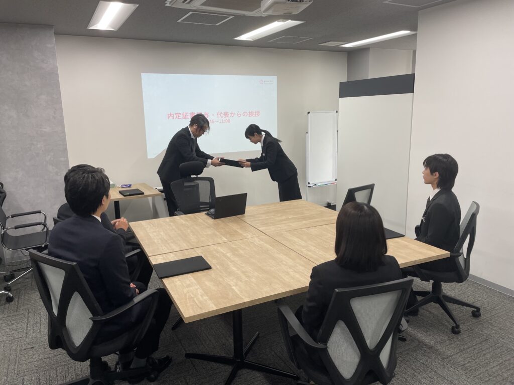 内定証書の授与を行い、久保社長から挨拶の言葉、